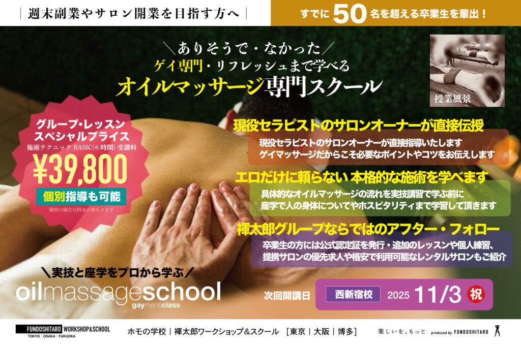 ゲイマッサージでは主流の『オイルマッサージ』を学べる学校は、